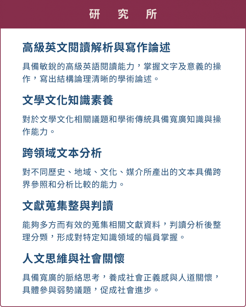 以跨領域的學術思考與整合為核心,一方面為有心進一步求取博士學位的碩士生作準備,另一方面培育具有開闊視野的文學與文化研究人才。